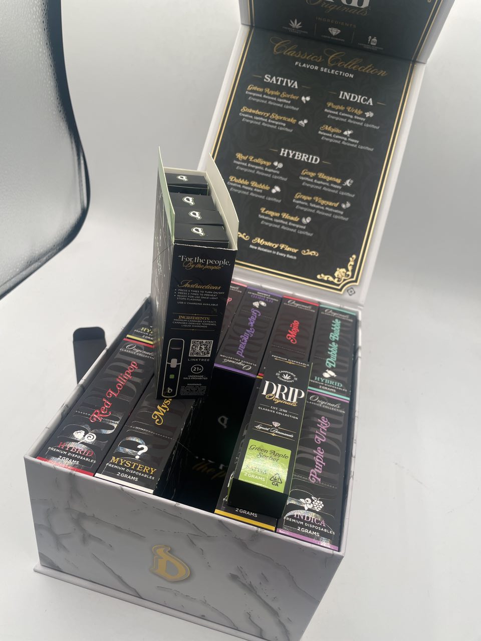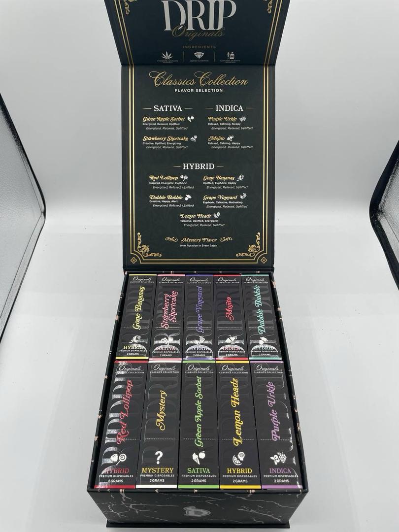 The Drip Originals 2G disposable lineup is crafted using premium cannabis genetics selected for flavor intensity and effect consistency. Popular strain profiles include: