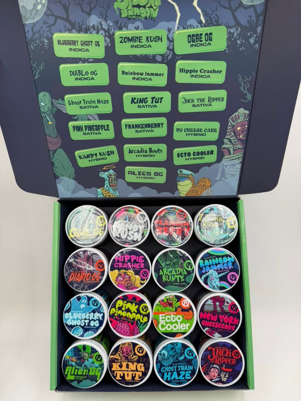 Blueberry Ghost, Zombie Kush, Ogre OG, Diablo OG, Rainbow Jammer, Hippie Crasher, Ghost Train Haze, King Tut, Jack Te Ripper, Pink Pineapple, Candy Kush, Arcadia Runt, Alien OG