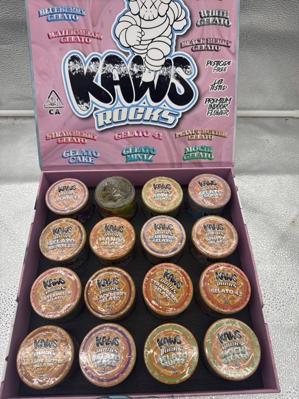 Looking for Kaws Moonrocks Gelato near me or Kaws Moonrocks Gelato for sale online? We offer fast, discreet shipping & delivery, ensuring your order arrives safely and securely. Bulk options like Kaws Moon Rocks 16 jars box and wholesale pricing are also available for serious buyers.