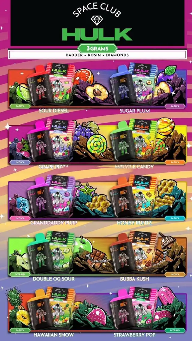 The Space Club Hulk edition features strain-specific terpene profiles inspired by legendary genetics. Popular Space Club Hulk 3G flavors include:
